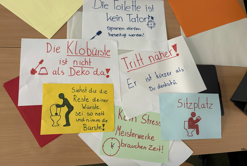 Das Projekt „Vandalismus: Was passiert auf unseren Toiletten?“, wurde für die Jahrgänge 8-12 angeboten. Betreut wurde das Projekt von Herrn Röder, Frau Hanke und Frau Sinske. Sie haben sich vorgenommen gemeinsam mit Schüler:innen die Toiletten zu verschönern, damit man an der Schule ein besseres Schulklima hat. Damit das möglich wird, haben die Schüler:innen Plakate erstellt, für den besseren Umgang miteinander. Vor allem wird der Wert auf das gemeinsame Zusammenleben gelegt.